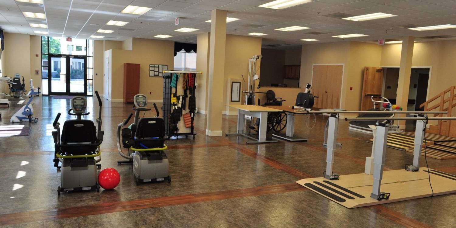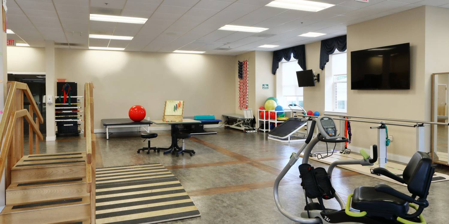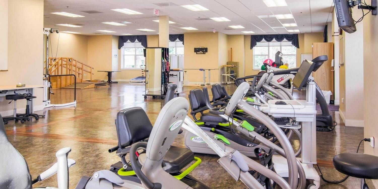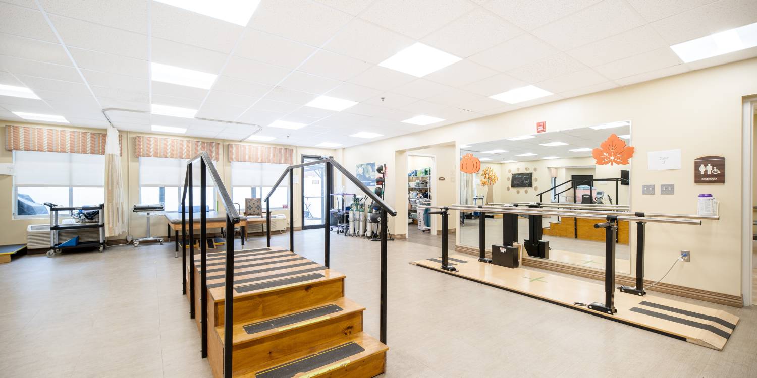 Therapy gym with private rehab rooms, and beauty/barber services to feel your best